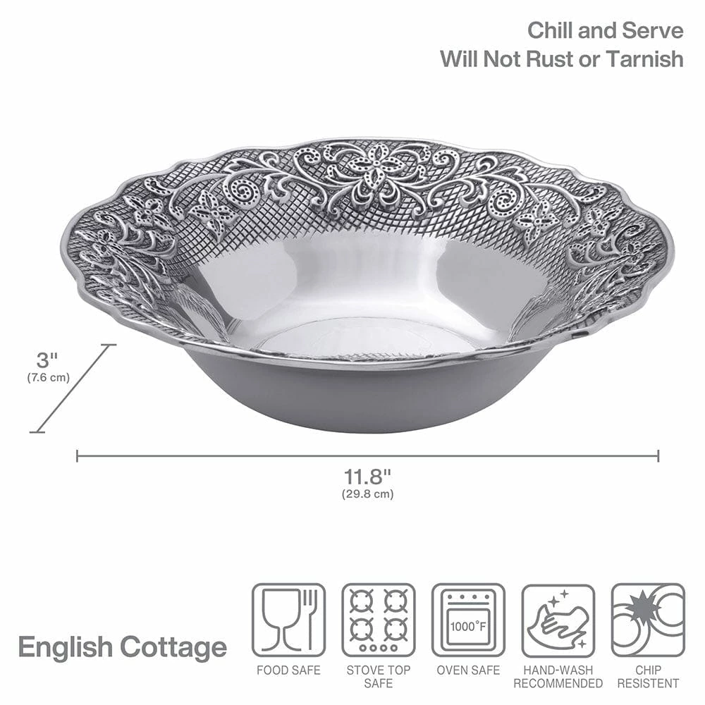 From our family of brands, this Wilton Armetale® English Cottage Round Bowl features a hand-sculpted floral motif set on a lace backdrop. Wilton Armetale® Serveware is ideal for your cooking needs, food stays hot longer and perfect for oven, stove or grill. Designed and crafted by hand, these beautiful products were made to last a lifetime.