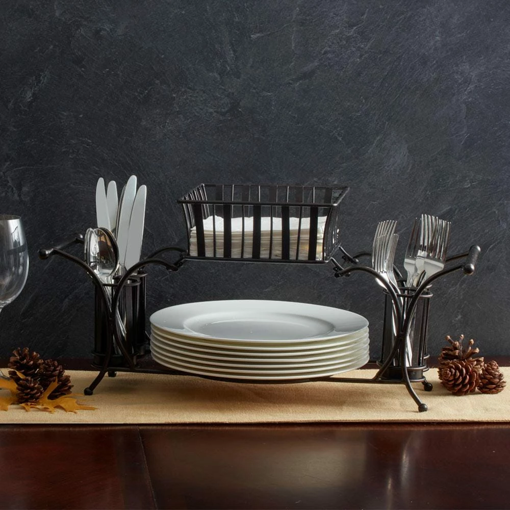 This Buffet Storage Caddy is a striking way to keep plates and flatware organized and easily accessible to guests. Caddy features four flatware compartments, center plate holder and a removable napkin caddy. Handcrafted from iron for long-lasting beauty even under rigorous use. Wipe clean with a damp cloth. Measures 21 x 8 x 7-1/2 inches. Napkin basket measures 8 inch square x 3-3/4 inch high.