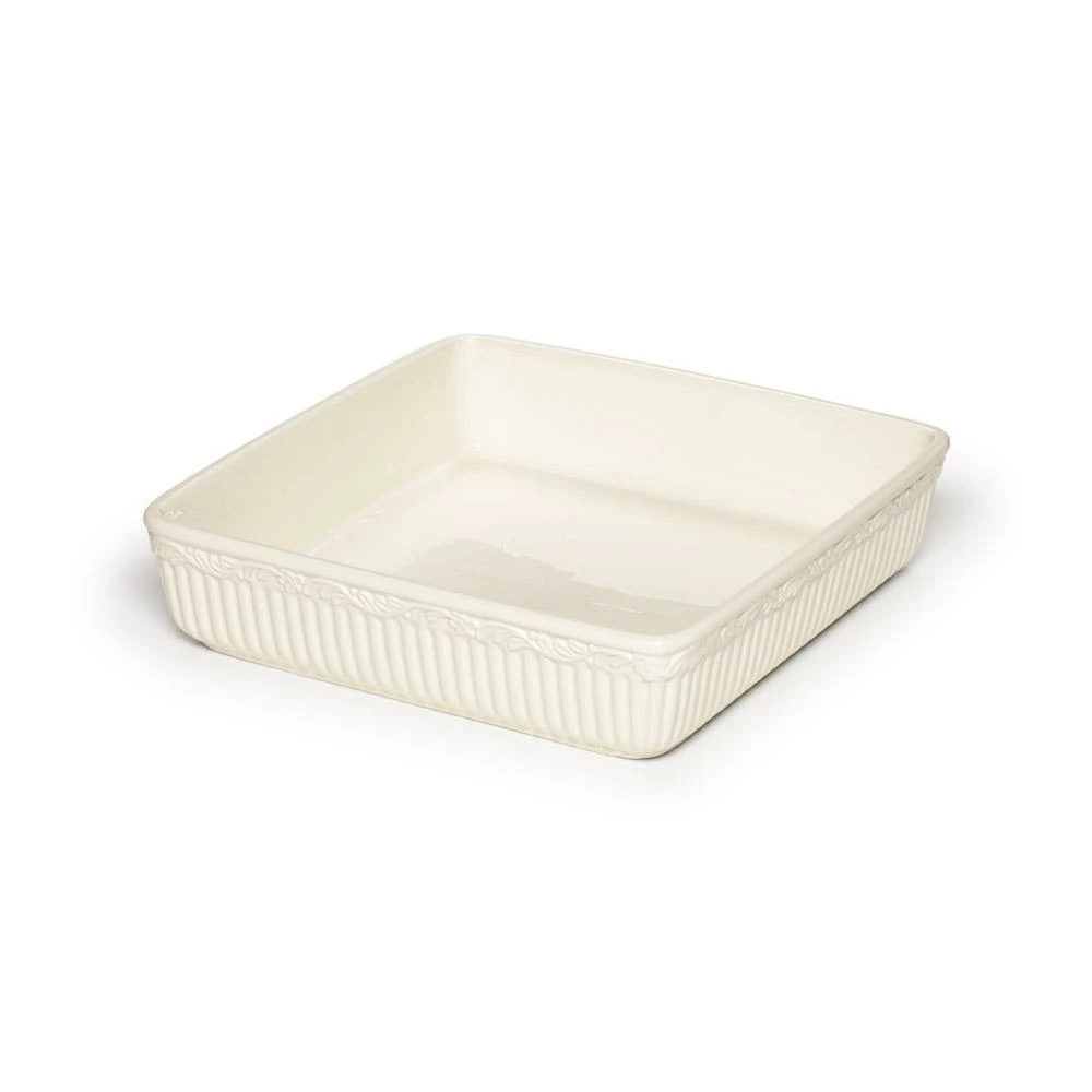 The fluted bands and column-like detailing of this dinnerware recall classical Italian architecture. A best selling pattern, a complete suite of accessories are available to create a classically stylish casual dining statement. Expertly crafted from stoneware. Dishwasher, microwave and oven safe up to 485 degrees F. This ceramic square baker will cook your favorite dishes thoroughly and makes an attractive presentation on your table. This one dish does it all; storing, baking and serving. Square baker measures 10 inch square.