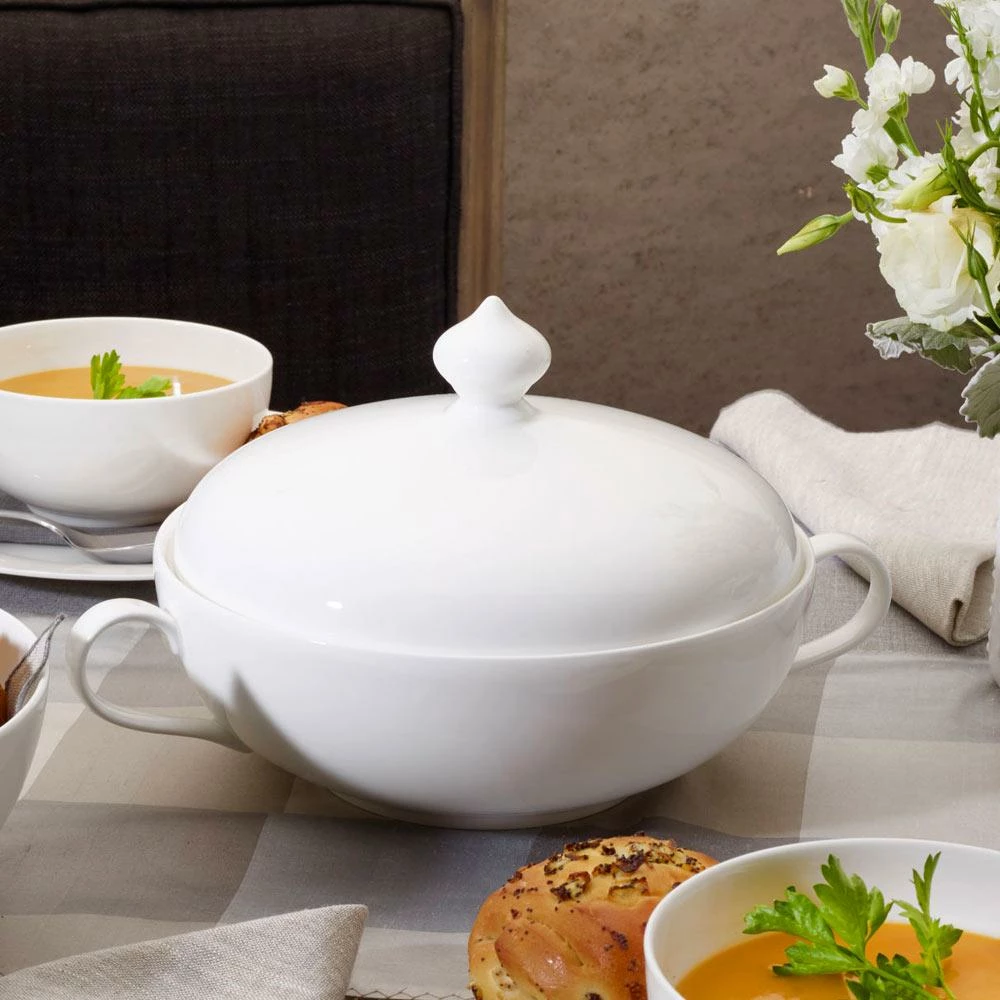 Streamline your everyday dining experience with the subtle sophistication of Lausanne. This basic white bone china offers a timeless elegance and a simplicity that complements any stemware and flatware, plus it’s versatile enough for both casual and formal dining. Microwave and dishwasher safe. Covered casserole holds 64 ounces.
