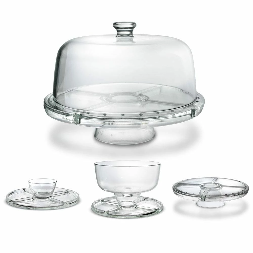 This Napoli Glass 4-in-1 footed cake plate with dome can be used as a Covered Cake Dome, a Chip and Dip, a Punch Bowl or Footed Platter. Crafted of glass. Dishwasher safe. Glass 4-in-1 server measures 12-1/4 inch diameter x 9 inches high.