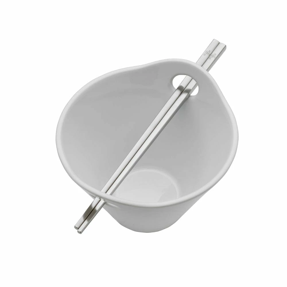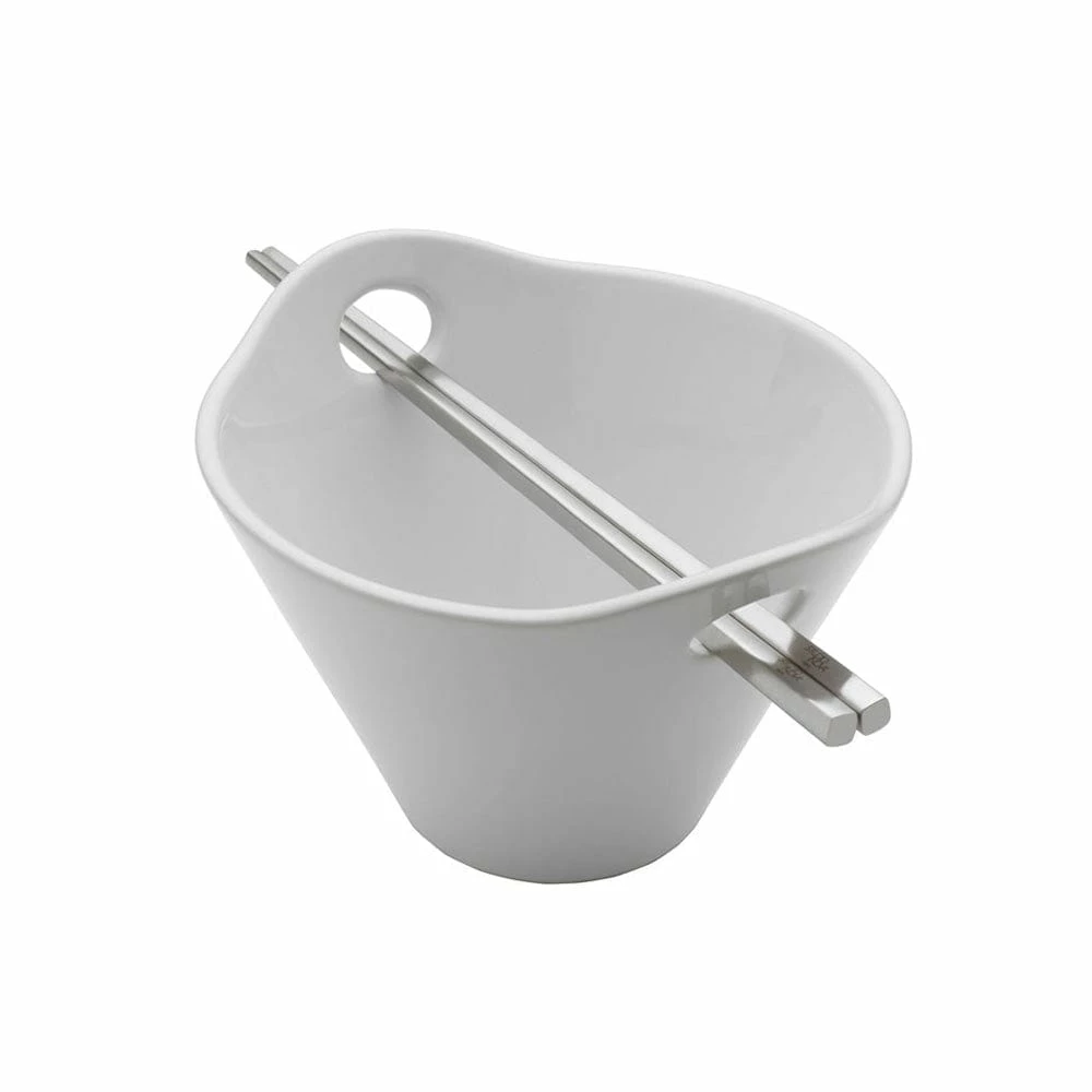 This Studio Nova Noodle Bowl with Chopsticks features a bowl with contemporary angles, a deep interior, plus two convenient cutout handles that the included chopsticks can easily slide through to keep the set stored together when not in use.