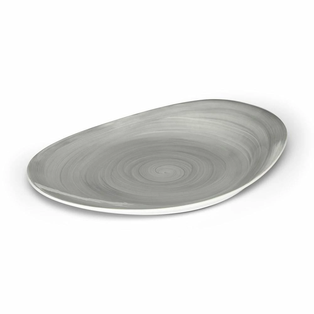Create a sophisticated and contemporary aesthetic with Savona dinnerware. The faces of these beautiful hand-painted plates have full-coverage color with a distinct swirl effect, while the mug and bowl are white on the exterior with the color on the inside to give your tabletop a unique, eye-catching look and feel. Use this oval platter to serve eggs with bacon & toast or stir fry with rice. Makes a handsome companion at a luncheon spread piled high with sandwiches or baked goodies. Crafted of high quality porcelain. Microwave and dishwasher safe. Oval platter measures 14 inch long.