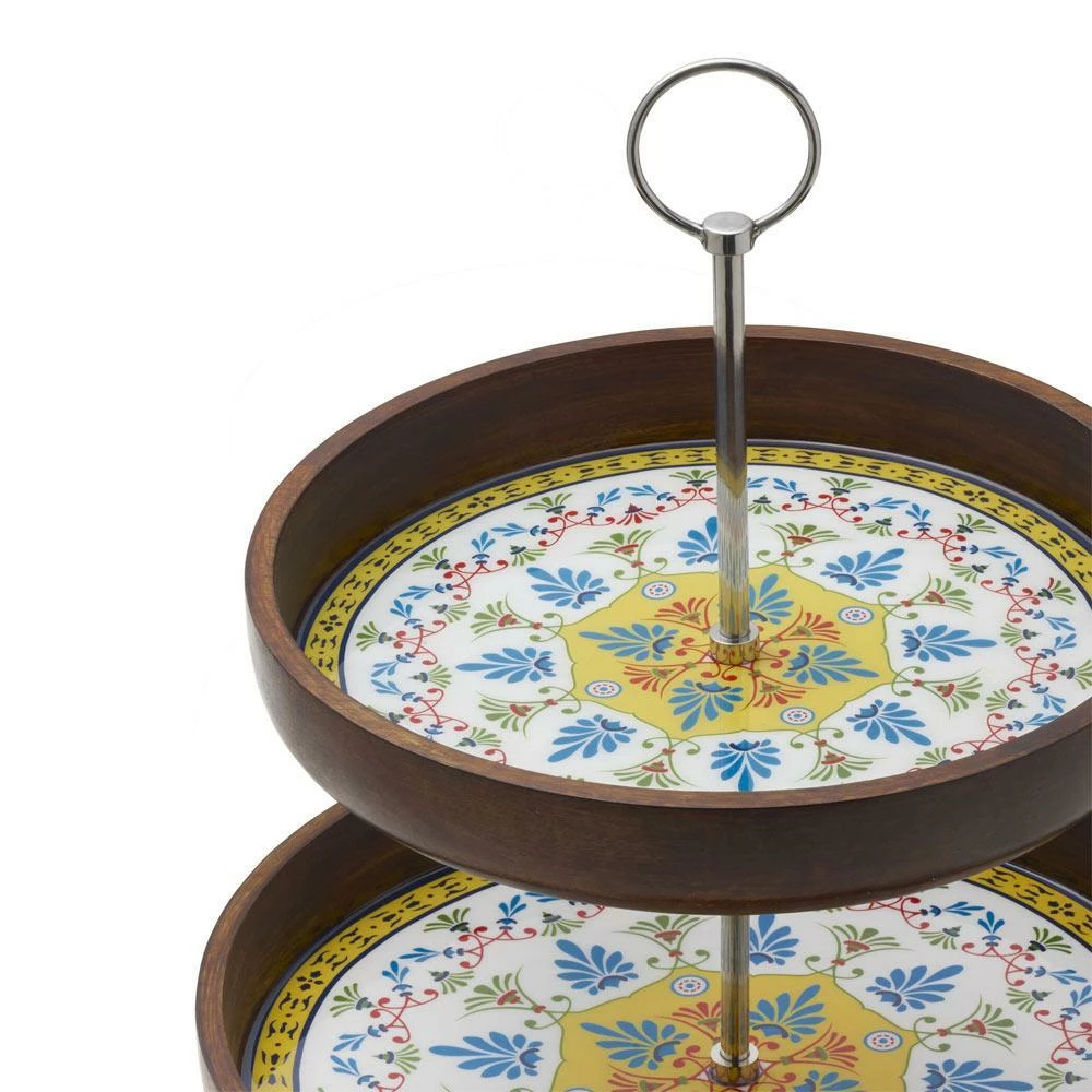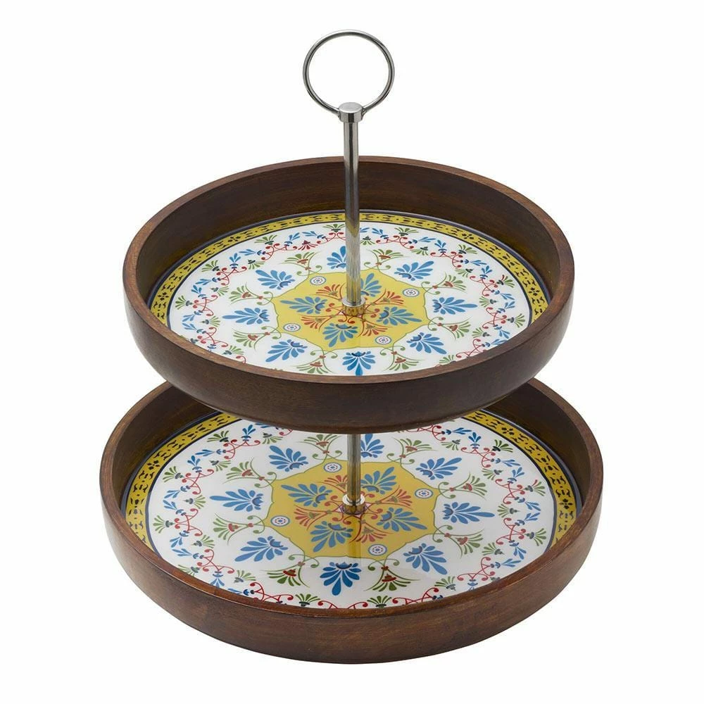 This Gourmet Basics by Mikasa Vella 2 Tier Mango Wood Tray will double your self-service space on a dinner table, picnic table, buffet table, or counter. Crafted of beautiful mango wood with an upper and lower platform, it provides twice the storage space and features high walls to ensure items stay on the trays. The durable aluminum post is topped with a strong carrying ring handle, and the surface of each tray features a striking, colorful medallion tile pattern. Wipe clean with a soft, damp cloth. Tray measures 17 inch high; top tray measures 12 inch diameter and lower tray measures 14 inch diameter.